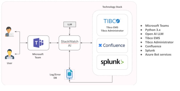 The diagram shows how Microsoft Teams connects through Azure Bot Services to power natural queries, which are interpreted by AI (LLM) and passed to backend systems like Tibco EMS, Tibco Administrator, Confluence, and Splunk. The seamless flow illustrates how StackWatch serves as a bridge between human queries and complex enterprise systems.